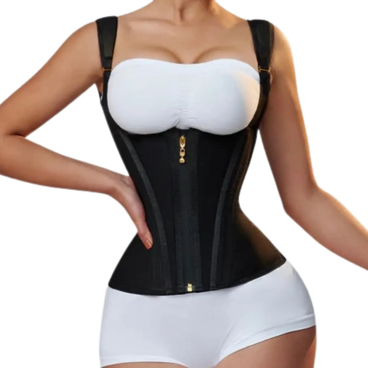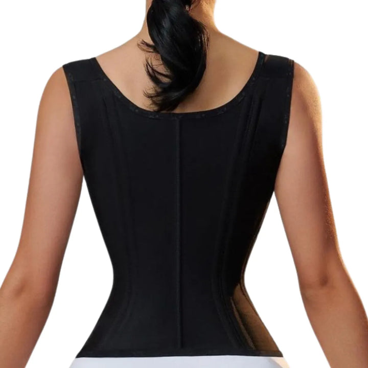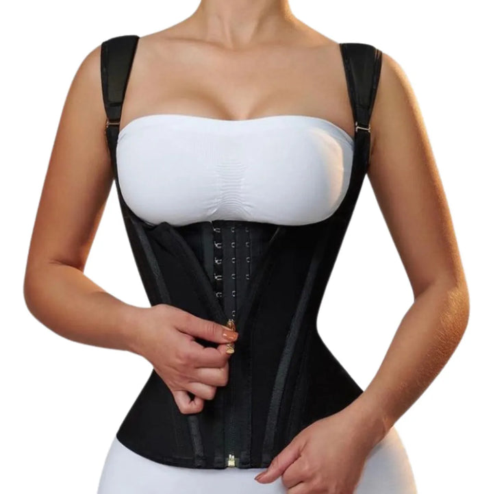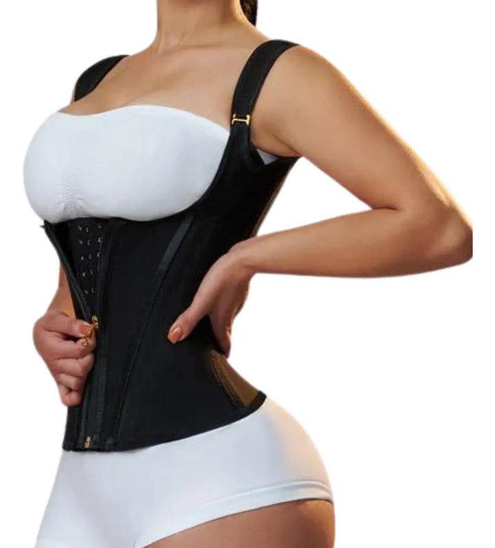 Hermosa faja chaleco hecha en la mejor calidad de Powernet, con broches ajustables y cremallera doble ajuste en la zona abdominal.